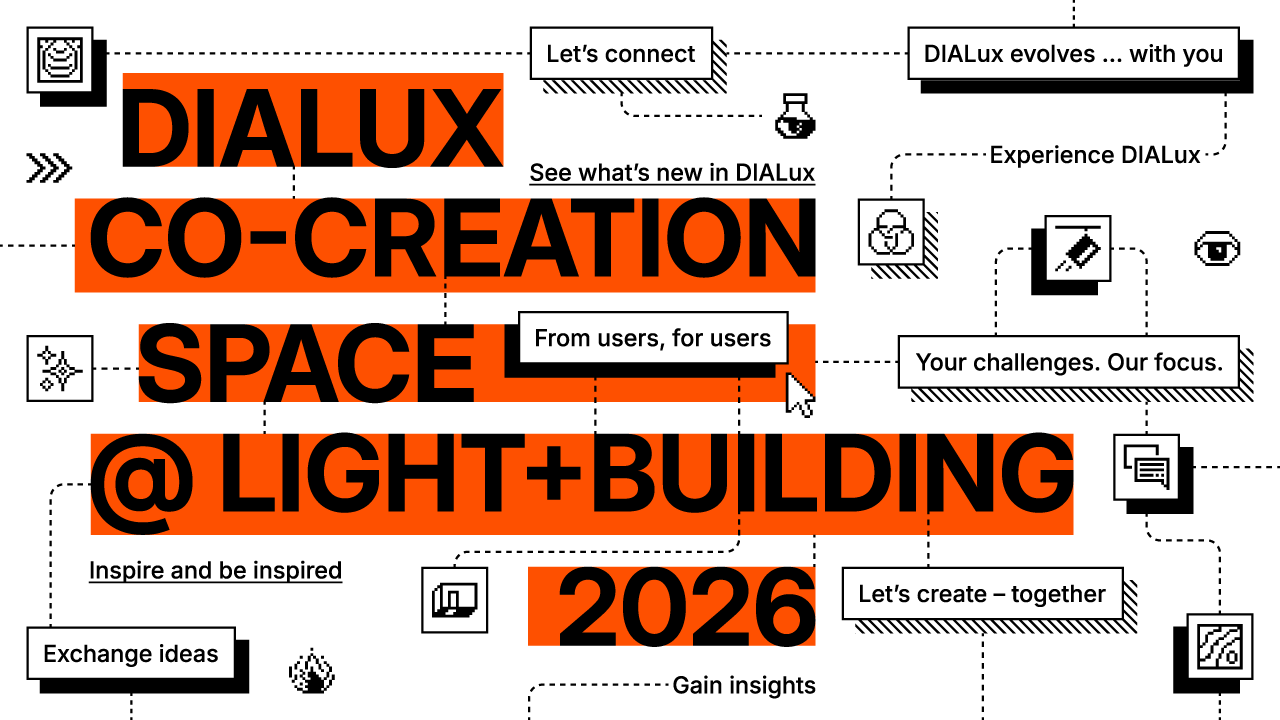 Vom 8. bis 13. März 2026 ist es wieder so weit: Die Light + Building findet in Frankfurt statt und wir sind dabei! Komm vorbei und entdecke, was es Neues von DIALux gibt. Erfahre, wie sich die Lichtplanung weiterentwickelt und wie DIALux Schritt für Schritt zu einer ganzheitlichen Software wird, die dich zuverlässig durch den gesamten Planungsprozess begleitet. Wir freuen uns auf dich!