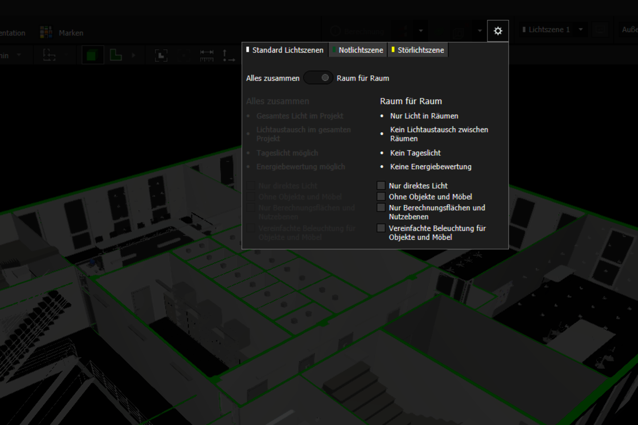 Optionen wie „nur direktes Licht berechnen“ oder „nur Berechnungsflächen berechnen“ können weiterhin verwendet werden und führen zu noch kürzeren Rechenzeiten, wenn schnelle Zwischenergebnisse oder Vergleiche benötigt werden.