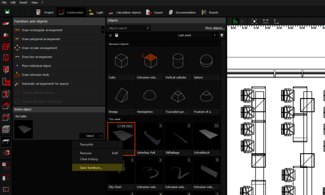 Mit DIALux evo 11 kannst du deine selbst konstruierten Möbel oder andere Objekte in DIALux speichern. Die Möbeldateien haben ein eigenes Dateiformat und können auch mit anderen DIALux Usern ausgetauscht werden.
