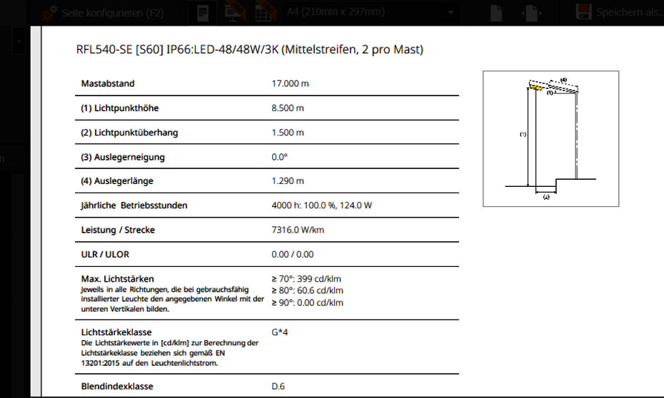 Du findest in der Dokumentation eine Zusammenfassung zu der Leuchtenanordnung und den baulichen Parametern der Straße sowie eine detaillierte Auflistung der Bewertungsfelder und deren Ergebnisse.
