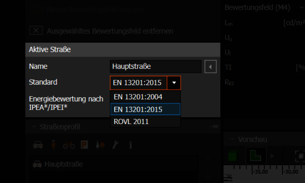 In DIALux evo beginnt dein Workflow mit deiner Planungsgrundlage – wähle die passende Norm und bestimme das Straßenprofil.