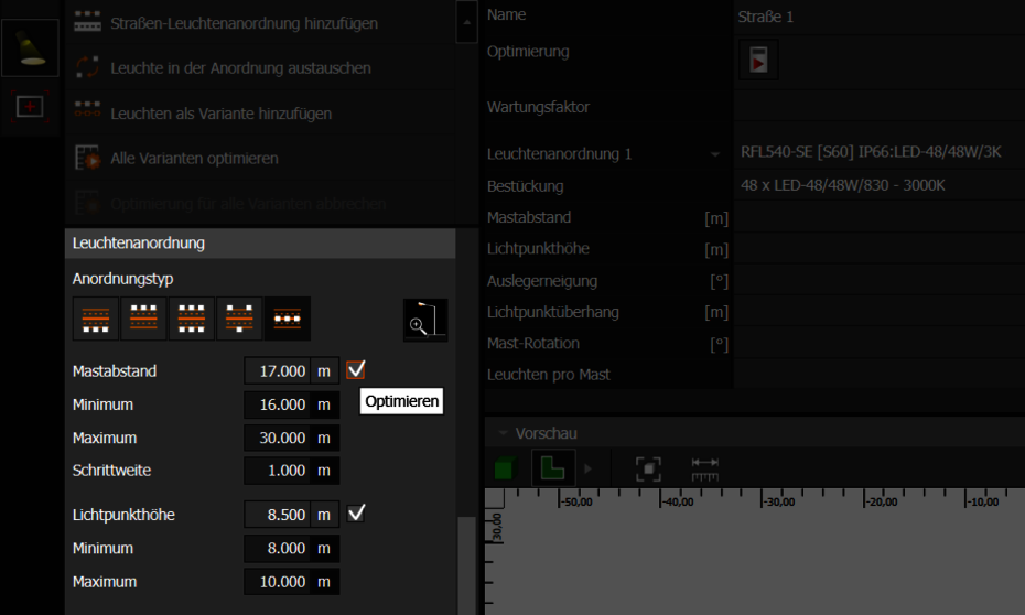 Mit DIALux evo kannst du die Leuchtenanordnung ganz unkompliziert anpassen. Wähle einfach aus fünf verschiedenen Anordnungstypen – von einseitig unten oder oben, über beidseitig gegenüber oder versetzt bis hin zur Mittelstreifenanordnung (steht nur zur Auswahl, wenn das Straßenprofil einen Mittelstreifen enthält).