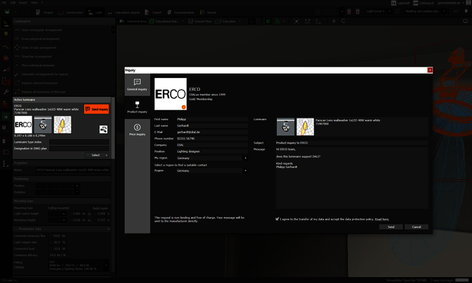 With DIALux evo 10.1 DIALux members can offer you an additional service. You can send an inquiry to brands that offer this directly from DIALux: a general inquiry, an inquiry about a product or a non-binding price inquiry. DIALux knows the right contact person for you and sends the necessary information about the selected product. You write your request directly in DIALux, the luminaire manufacturer receives it in the form of an e-mail from us and will then contact you directly about your request via your preferred channel (e-mail, telephone, video call...). If you work with ERCO or Whitecroft products, and have a question, give the service a try.
