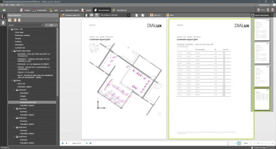 For the table pages in the site plan, there is an additional layout alternative that is significantly more compact. In this layout, we have deliberately dispensed with the specification of arrangement parameters and the graphic representation of logos and product images. Basically, we simply list luminaires with their mounting positions. This layout results in a page saving of up to 50 % per site plan.