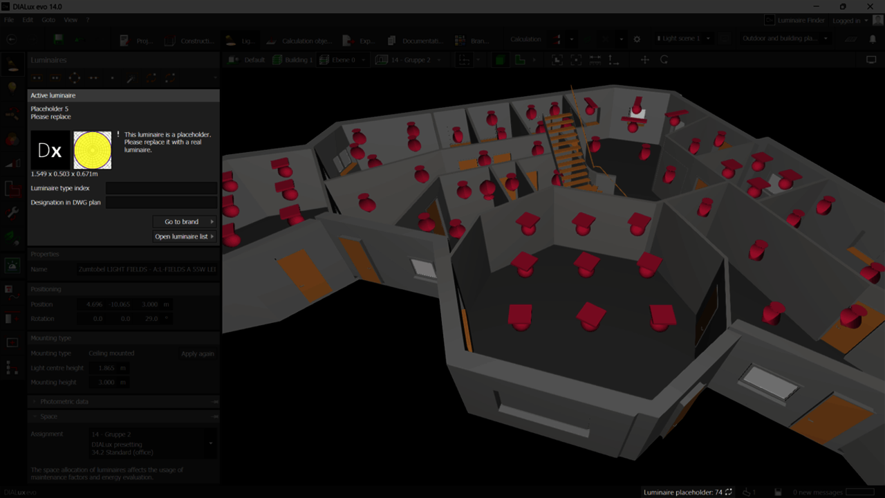 If the lighting design was initially created directly in Revit, this workflow also works seamlessly. Luminaires that have already been placed are imported into DIALux as placeholder luminaires. While these do not contain photometric data, they are clearly identifiable and aligned with the Revit objects. With just a few clicks, you can replace them with real luminaires and continue your planning.