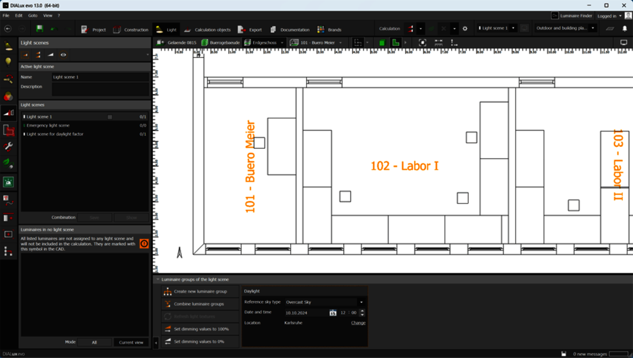 - The daylight calculation is activated by selecting a sky model of a time in the light scene tool.