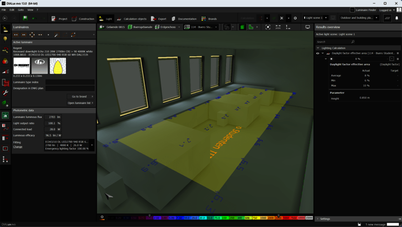 DIALux receives this information about the ambient conditions via the defined spaces. You must therefore define these in the room. For example, daylight has a different effect if a clean room such as a laboratory or office is defined than in a workshop or similar. You make these decisions by defining a suitable space and selecting an application profile.