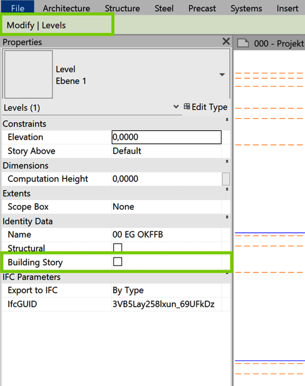 In Revit, storeys are defined by levels (cut planes). If you activate the “Building Storey” checkbox, a storey is automatically generated in the IFC file during export.