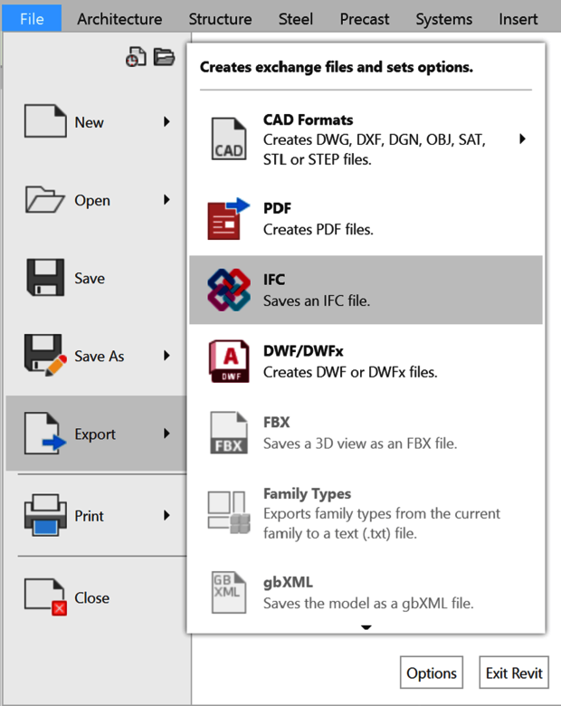Start by exporting your Revit model: Revit Menu → File → Export → IFC
