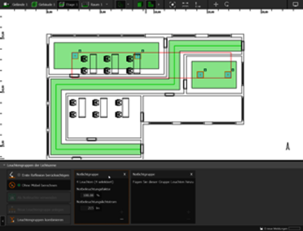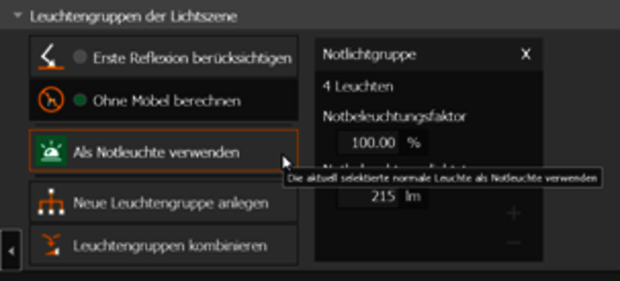 Cualquier luminaria puede utilizarse para el alumbrado de emergencia. El fabricante puede definir las superficies emisoras de luz que se destinan específicamente al alumbrado de emergencia. Esta información es utilizada por evo. En caso contrario, el usuario debe realizar los ajustes. Se puede ajustar el flujo luminoso o el factor de iluminación de emergencia, y los dos valores se convierten el uno en el otro. Para cada superficie emisora de luz, se puede especificar si se va a utilizar sólo para la iluminación de emergencia, sólo para la iluminación normal o para ambos casos.