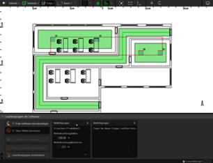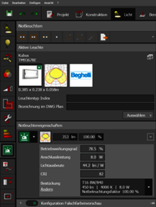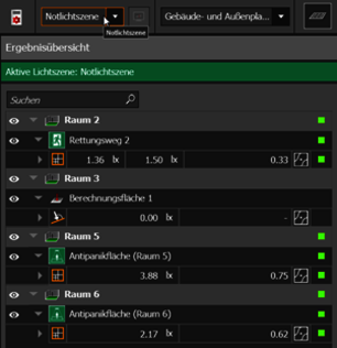 - Der Ergebnismonitor zeigt auch die Berechnungsergebnisse der Notbeleuchtungsflächen an. Die Notlichtszene wird farblich hervorgehoben