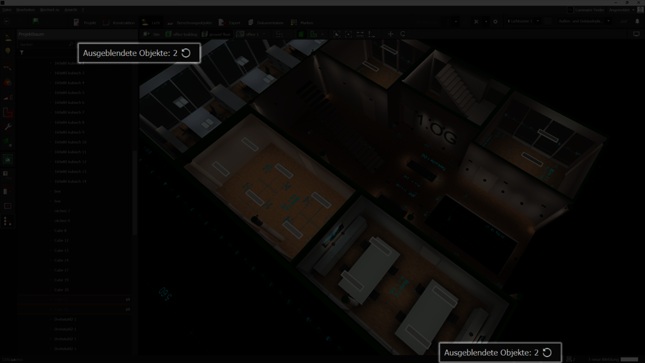 Eines der am häufigsten gewünschten Features ist endlich da: Ab sofort kannst du jedes beliebige Objekt in der CAD-Ansicht flexibel ein- oder ausblenden – von der kleinsten Schraube bis hin zum ganzen Gebäude. Diese, in der DIALux Community, stark nachgefragte Verbesserung gibt dir volle Kontrolle über visuelle Störungen während der Planung.