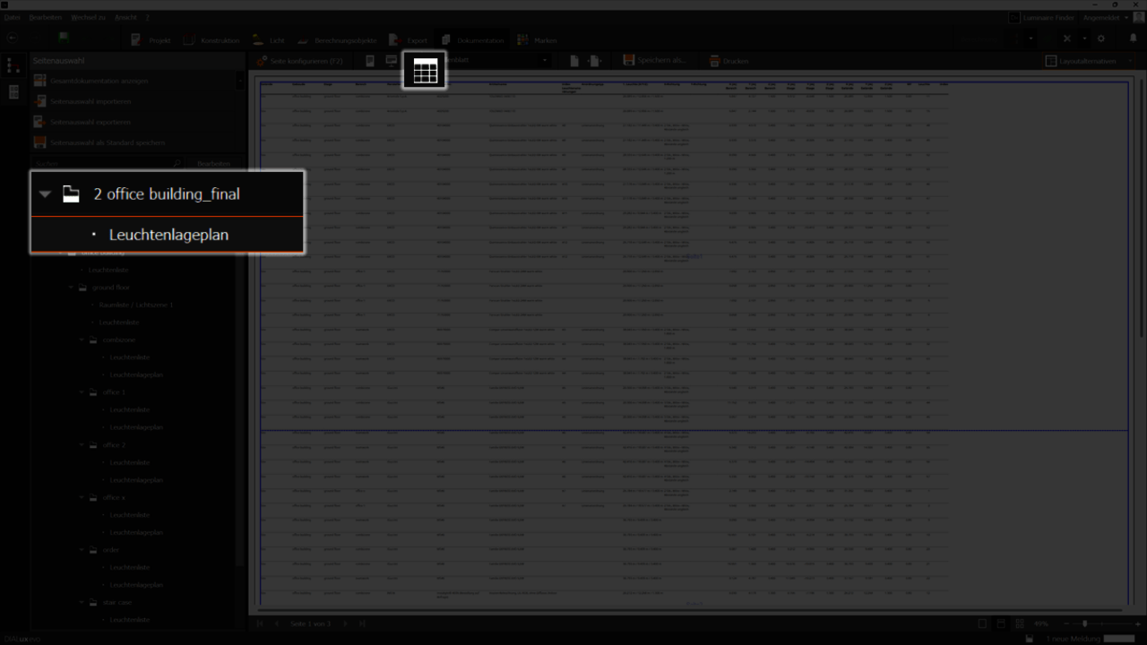 Du kannst die Tabelle in verschiedenen Formaten exportieren: PDF, Excel, CSV oder XML. Jede Leuchte enthält nun detailliertere Infos, wie Standort (Gebäude, Geschoss, Raum), Montageposition und Drehung. Das sorgt für eine bessere Abstimmung im Team, weniger Missverständnisse und einen klaren Überblick.