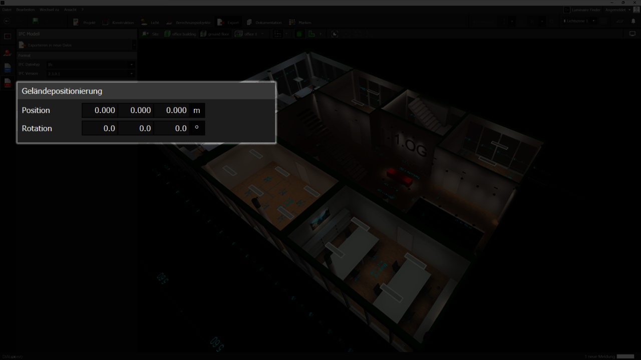 In echten Projekten arbeiten häufig verschiedene Teammitglieder parallel an Lichtplanung und IFC-Modellen. Mit DIALux evo 13.2 kannst du nun beim Export den IFC-Einfügepunkt und die Ausrichtung anpassen. So stellst du sicher, dass dein Lichtdesign exakt mit dem IFC-Modell übereinstimmt. Deine Einstellungen werden im Projekt gespeichert – du musst sie also nur einmal festlegen.