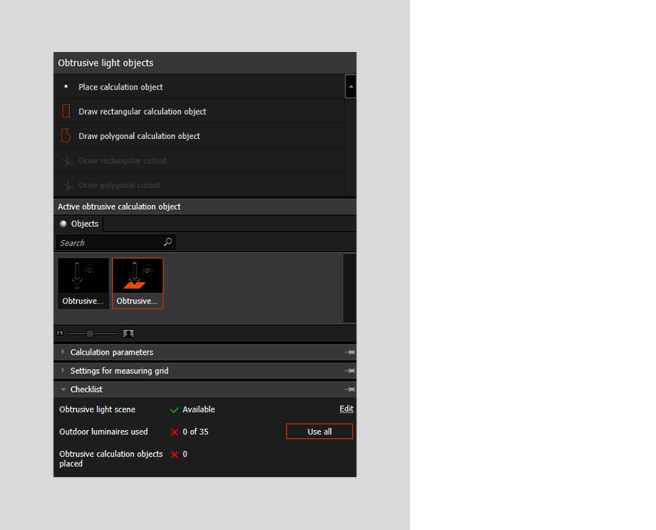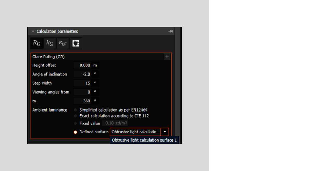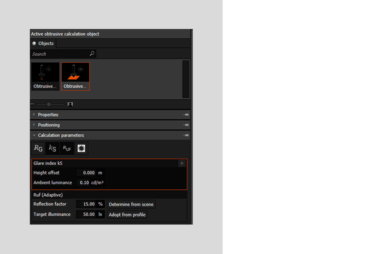 Wir haben ganz neue Berechnungspunkte und Raster speziell für Störlichtgrößen entwickelt, um die Werte für ks, I und Ruf zu bestimmen. Das Ruf-Raster erfordert zusätzliche Parameter wie Zielbeleuchtungsstärke und Reflexion, die du direkt aus der Szene übernehmen kannst.