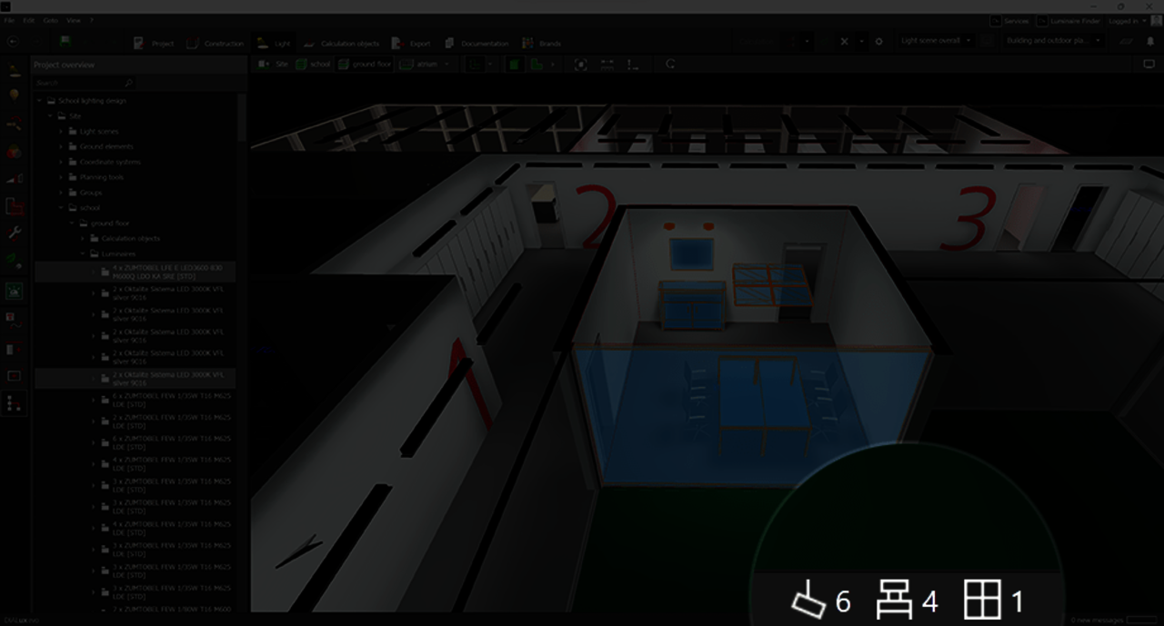 In der Statuszeile kann nun die Anzahl der selektierten Objekte angezeigt werden. Dies funktioniert für Leuchten, Öffnungen und Möbel. Alles was du dabei machen musst, ist lediglich die Leuchten, Möbel/Objekte oder Raumelemente zu markieren. Auch gemischte Selektionen über den Projektbaum sind möglich.