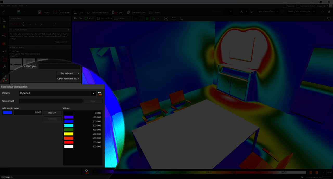 Bisher verfügte DIALux nur über eine einheitliche Falschfarbentabelle. Mit der neuen Version kannst du diese Tabelle bearbeiten und Farben hinzufügen, löschen und zuweisen. Erstelle ganz einfach personalisierte Falschfarben für verschiedene Anwendungen, z. B. für die Innenbeleuchtung, die Außenbeleuchtung und die Notbeleuchtung. Diese Falschfarben können gespeichert und in zukünftigen Projekten wiederverwendet werden.