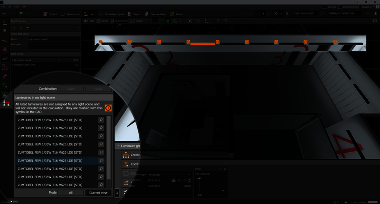 DIALux evo stellt im Regelfall sicher, dass alle Leuchten mindestens einer Lichtszene zugeordnet sind. Dennoch ist es möglich, dass bei der Arbeit mit Lichtszenen einige Leuchten nicht zugeordnet werden. Diese werden dann nicht in die Berechnung einbezogen, da DIALux die Lichtszene szenenweise berechnet. Die neue Anzeige listet diese nicht zugeordneten Leuchten auf, die ausgewählt und im CAD angezeigt werden können. Du kannst diese Leuchten nun einfach zu einer bestehenden Lichtszene hinzufügen oder eine neue Lichtszene erstellen.