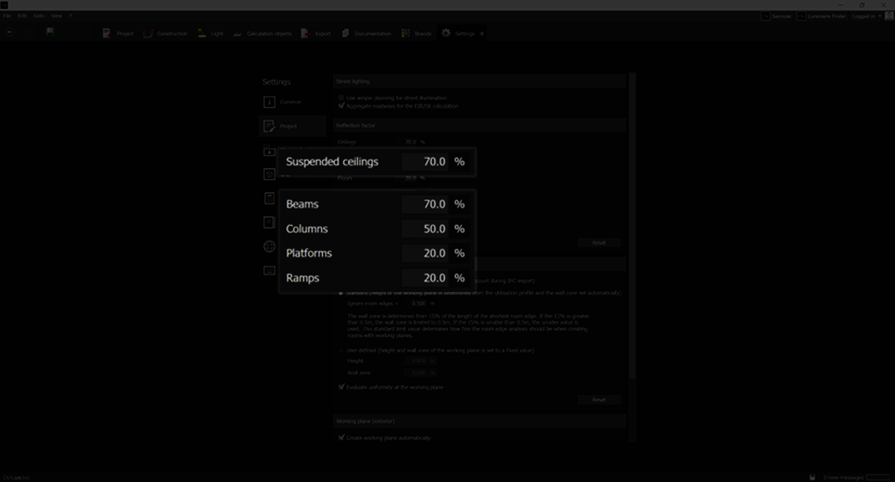 Darüber hinaus gibt es einige zusätzliche Änderungen, die dir die Arbeit mit DIALux evo erleichtern. Die Programmeinstellungen wurden um Standardreflexionswerte für abgehängte Decken und einige Raumelemente erweitert.