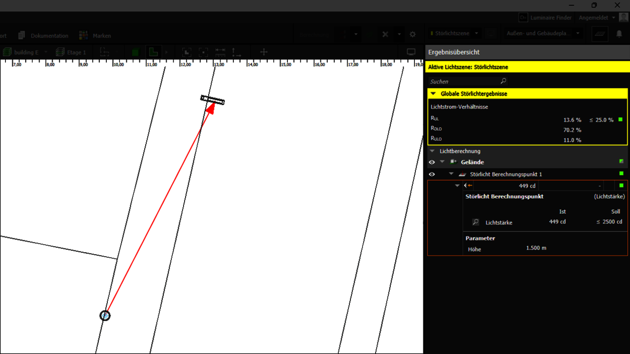 - Die Lichtstärkenanalyse zeigt dir die verursachenden Leuchten – rote Pfeile kennzeichnen Grenzwertüberschreitungen.