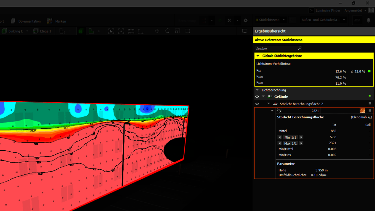 Die Ergebnisse werden kompakt in einer Störlichtzusammenfassung dokumentiert – inklusive Grenzwerten. Auf Wunsch kannst du alle Berechnungsparameter der verwendeten Objekte zusätzlich ausgeben lassen.