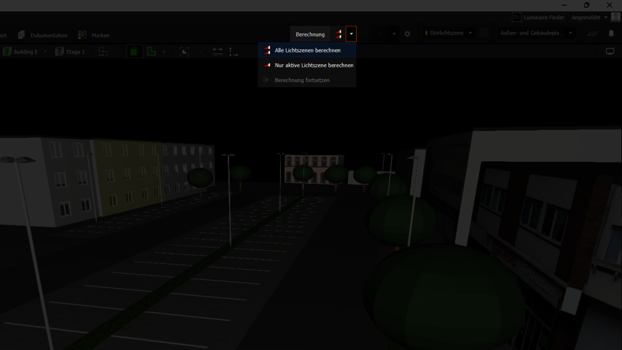 Starte die Berechnung deiner Störlicht Lichtszene. Alternativ kannst du alle Lichtszenen gemeinsam berechnen lassen. Die Berechnung erfolgt sehr schnell – auch bei größeren Projekten.