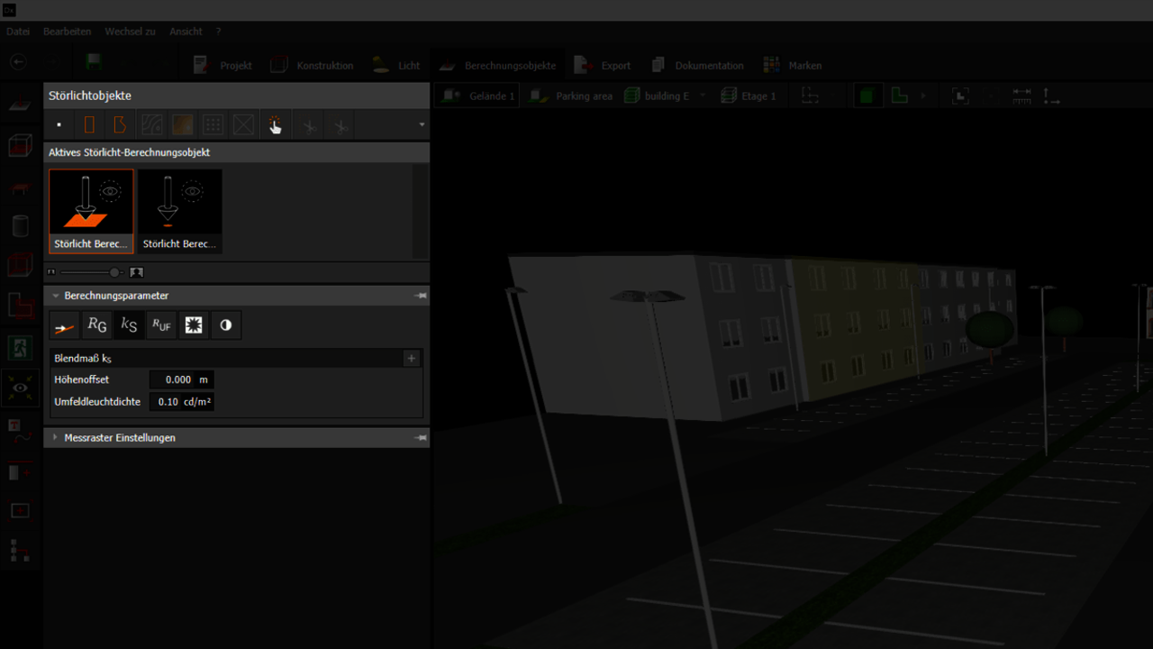Im Modus „Berechnungsobjekte“ aktivierst du das Tool „Störlichtobjekte“. Hier platzierst du Berechnungspunkte und -flächen an relevanten Positionen, z. B. an Fassaden oder kritischen Bereichen.