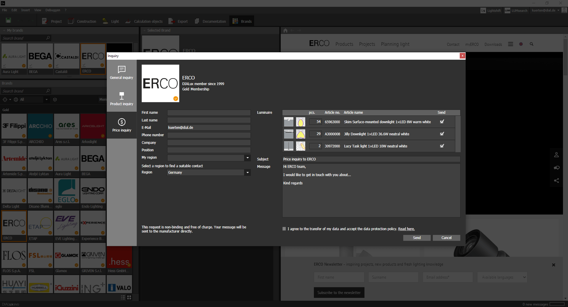 Mit DIALux evo 10.1 können DIALux Member einen zusätzlichen Service anbieten. Anwender*innen können Marken, die dies anbieten, direkt aus DIALux eine Anfrage schicken: Eine allgemeine Anfrage, eine Anfrage zu einem Produkt oder eine unverbindliche Preisanfrage. DIALux kennt die richtigen Ansprechpartner für und schickt die notwendigen Informationen zum ausgewählten Produkt gleich mit.