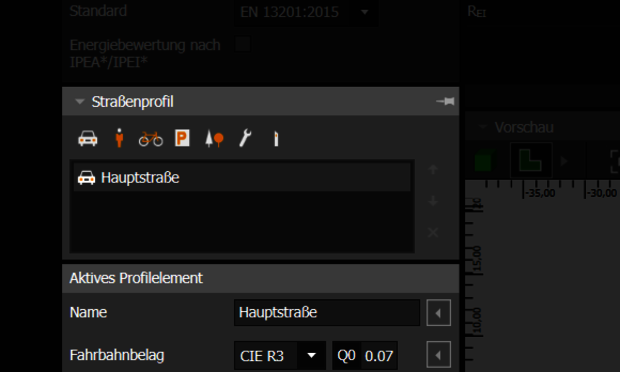 Der Aufbau und die Nutzung der Straße ist entscheidend für deine Lichtplanung. In DIALux evo lassen sich alle Parameter detailliert einstellen. Bestimme die Fahrbahnbreite und -anzahl (z. B. ein- oder mehrspurig), Geh- und Radwege, Park- und Grünstreifen, Notfallspur und Mittelstreifen. Zusätzlich kannst du Detaileinstellungen wie den Fahrbahnbelag verändern.