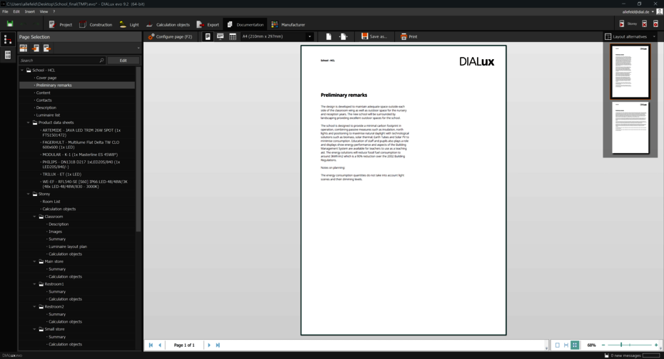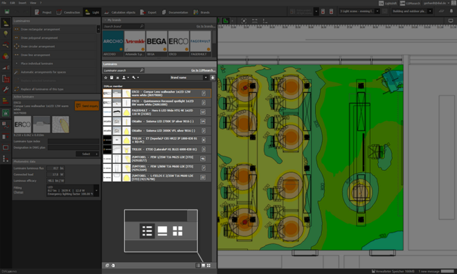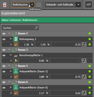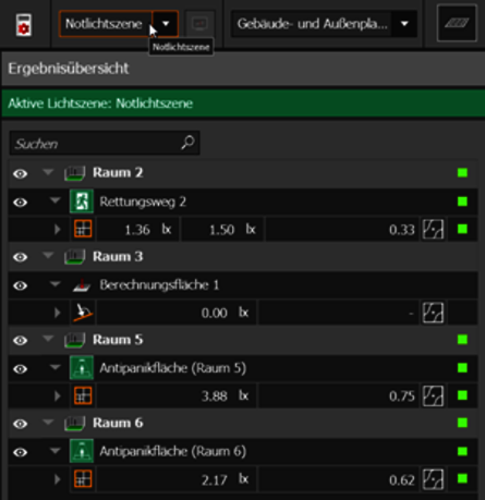 - The result monitor also shows the calculation results of the emergency lighting areas. The emergency lighting scene is highlighted in colour