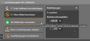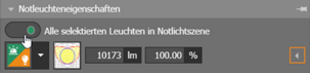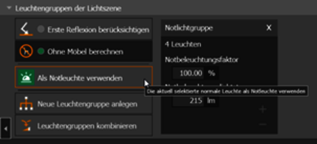 Any luminaire can be used for emergency lighting. The manufacturer can define light-emitting surfaces that are specifically intended for emergency lighting. This information is used by evo. Otherwise, the user must make the settings. Luminous flux or emergency lighting factor can be set, and the two values are converted into each other. For each light-emitting surface, it can be specified whether it is to be used only for emergency lighting, only for normal lighting or for both cases.
