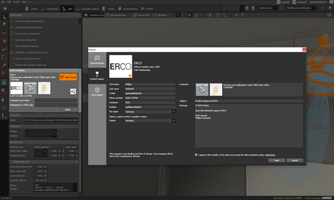 With DIALux evo 10.1 DIALux members can offer you an additional service. You can send an inquiry to brands that offer this directly from DIALux: a general inquiry, an inquiry about a product or a non-binding price inquiry. DIALux knows the right contact person for you and sends the necessary information about the selected product. You write your request directly in DIALux, the luminaire manufacturer receives it in the form of an e-mail from us and will then contact you directly about your request via your preferred channel (e-mail, telephone, video call...). If you work with ERCO or Whitecroft products, and have a question, give the service a try.