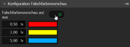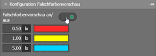 - The result preview shows a real-time visualisation of the expected results. Prerequisites for this are emergency lighting objects, an escape route or an anti-panic area, as well as at least one selected luminaire in the emergency lighting scene. The result preview is activated with the False colour preview on/off switch in the False colour preview configuration tool