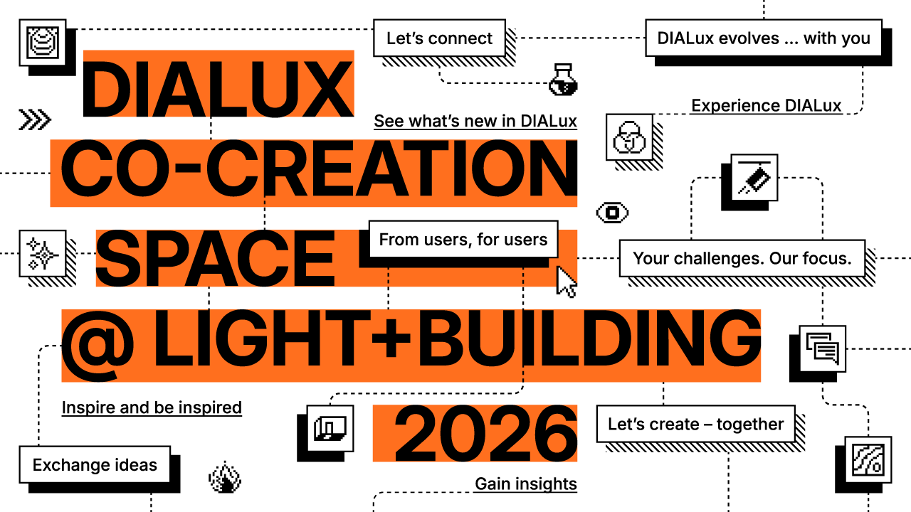 From March 8 to 13, 2026, it’s happening again: Light + Building will take place in Frankfurt — and we’ll be there! Stop by and discover what’s new in DIALux. Learn how lighting design continues to evolve and how DIALux is gradually becoming a holistic software solution that reliably guides you through the entire planning process. We’re looking forward to seeing you!