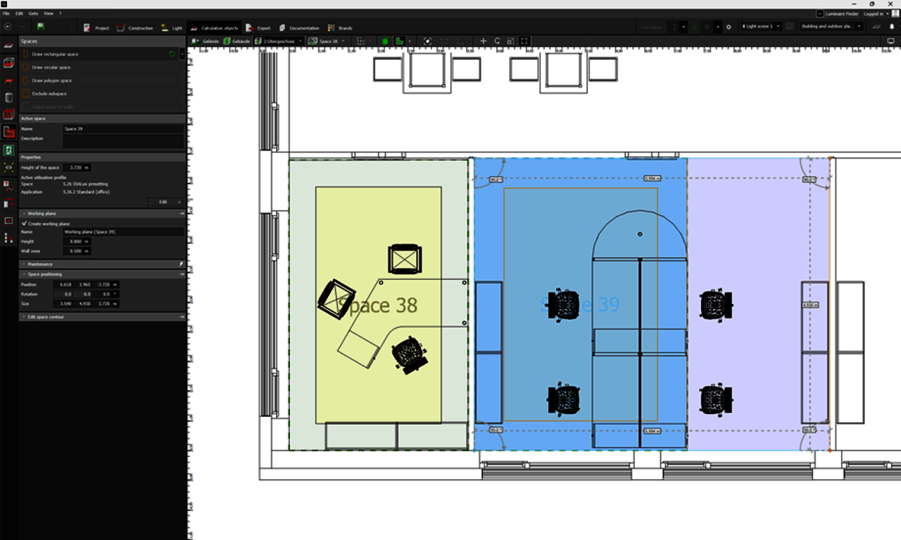 DIALux also offers the option of creating spaces at any time using the "Spaces" tool. For example, if no spaces are identified in an IFC, these can be added individually. These spaces are an important tool for defining specific planning cases. While spaces are initially created automatically for rooms, they can be adapted and changed at any time to meet individual requirements.
