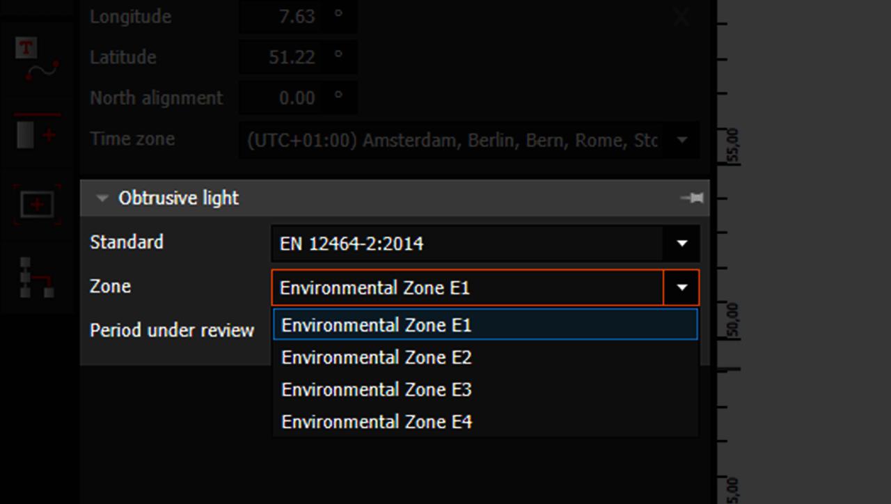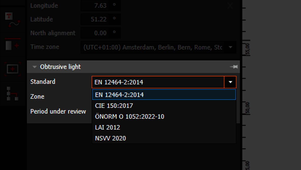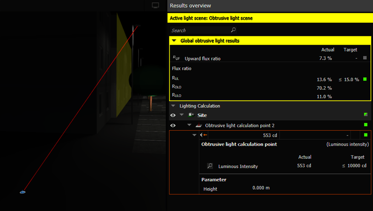 You can now specifically analyze vertical illuminance and luminance using the tool for identifying light immissions. These parameters are also required by the mentioned standards as a basis for verifying obtrusive light.