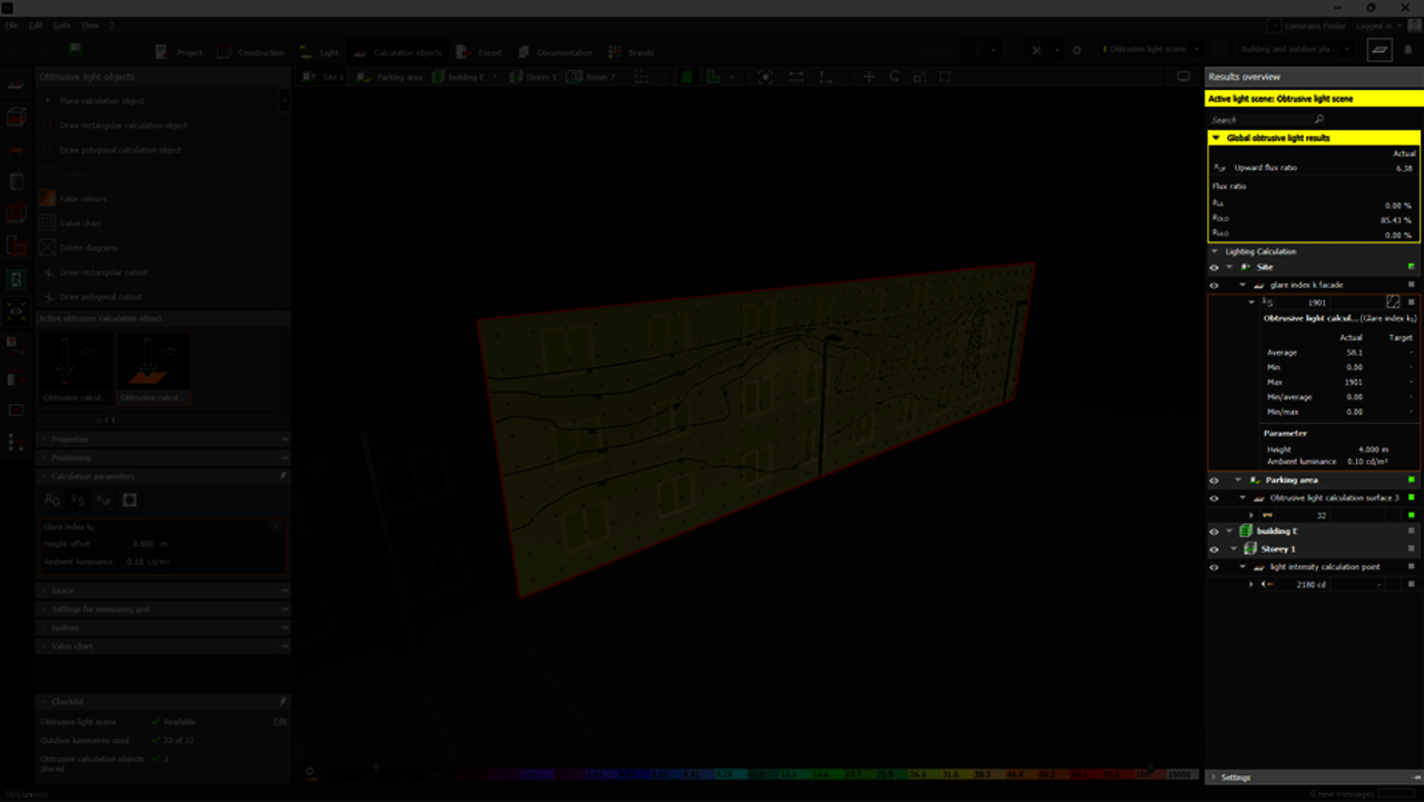 To assist with the process, DIALux evo 13 includes a checklist outlining all the necessary settings for calculating obtrusive light. This feature ensures no step is overlooked during the design and evaluation process, simplifying compliance with industry standards.