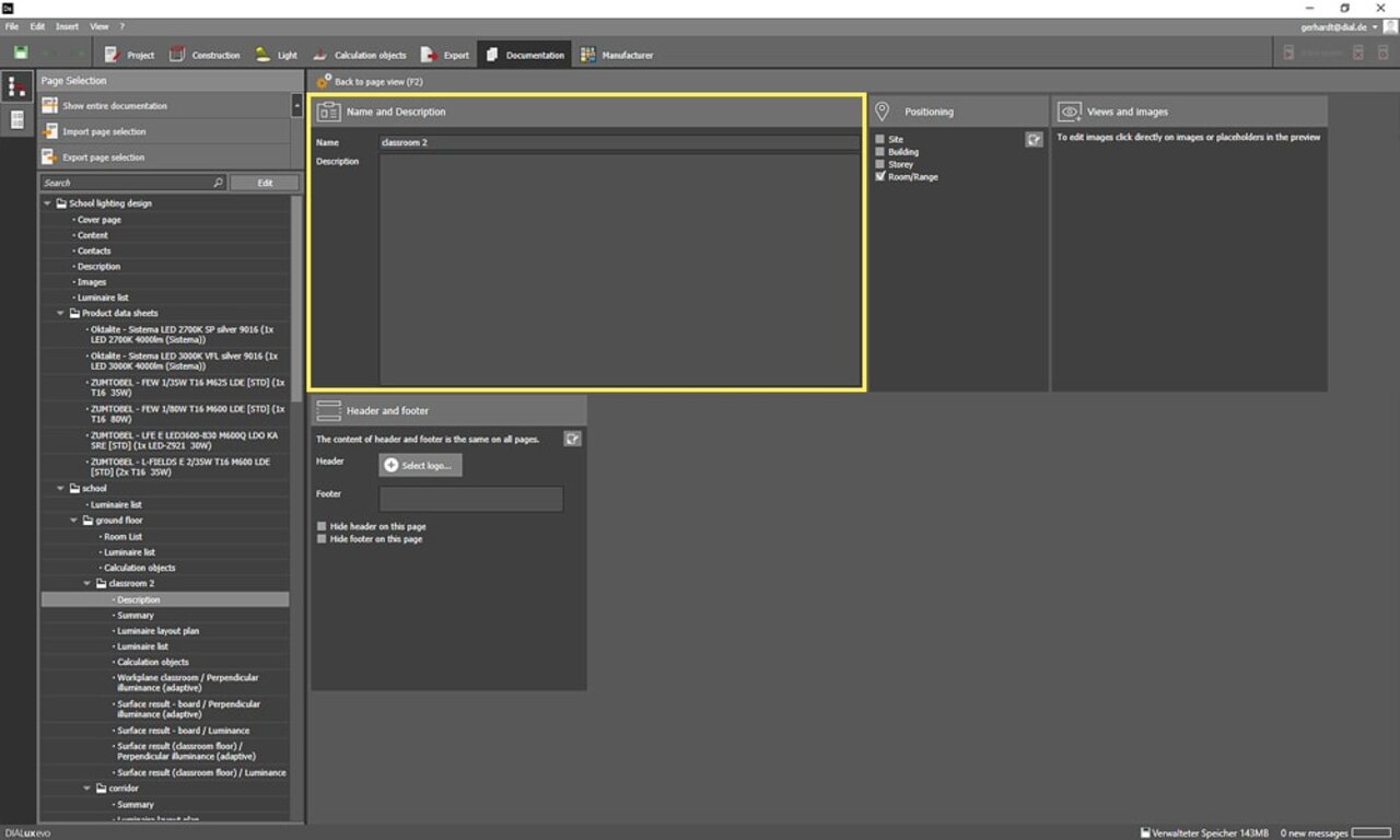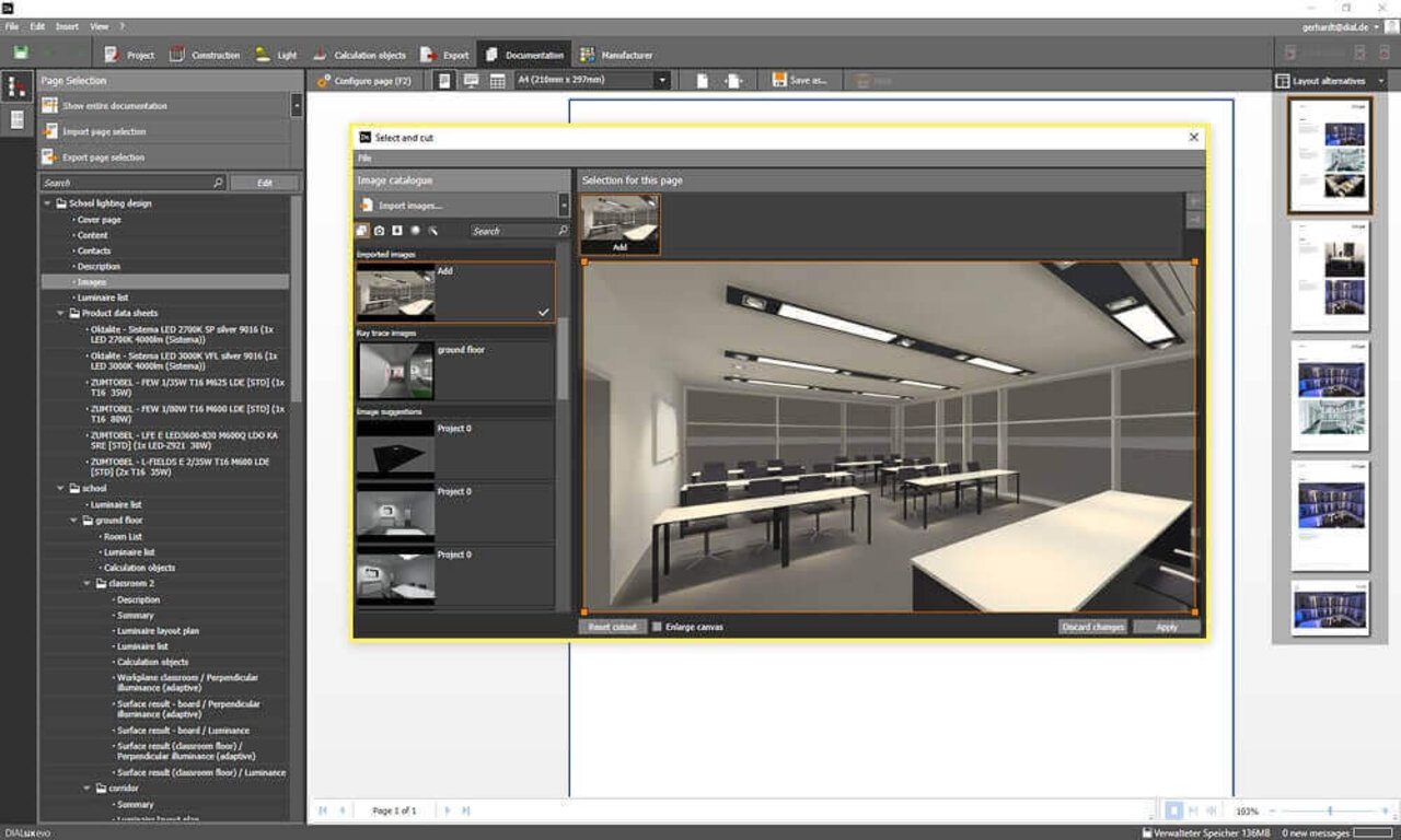 You want to create your documentation even more appealing and simple? We have simplified the workflow for organizing images: You can now import images directly from the file system or the Windows clipboard by drag & drop. It is also possible to specify the desired image sections directly during selection. In addition, we offer you a range of automatically generated views of your project, which can be used by DIALux evo directly when creating the documentation. You can easily select and deselect these views.