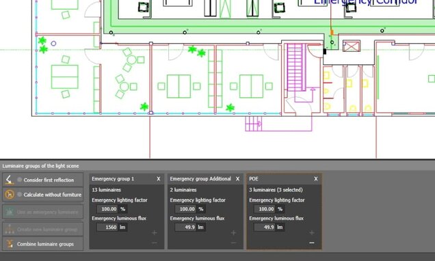 An important part of the development for emergency lighting is of course the standard-compliant calculation. Many special settings are required, e.g. the number of calculated reflections and the consideration, or not, of furniture. The possibility to calculate single light scenes separately will save you a lot of time during optimization.