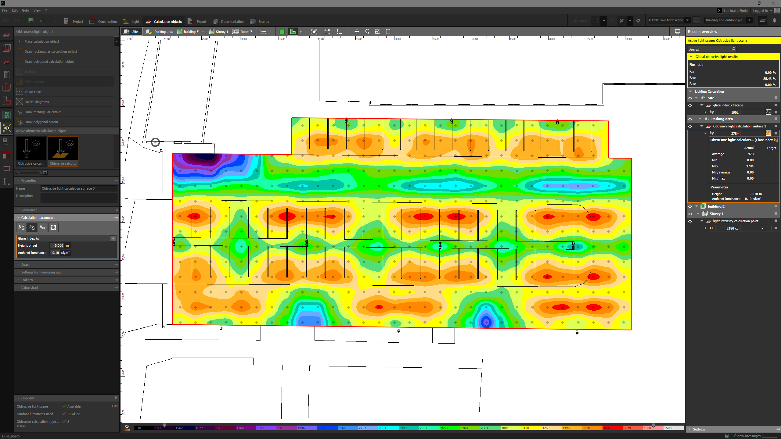 Planners now have access to a new light scene in DIALux for calculating obtrusive light, which automatically considers a maintenance factor of 1 and allows all outdoor luminaires to be added with a single click. With a new tool, planners can place calculation objects for obtrusive light assessment and determine the following values: I (light intensity), ks (glare value), as well as the light flux ratios Ruf, Rul, RULO, and RDLO. A checklist helps the planner verify if all necessary steps for an obtrusive light calculation have been implemented. The glare value (ks) can be visualized as isolines, false colors, or value diagrams, allowing for intuitive analysis in complex scenes. DIALux evo 13 provides new output layouts for documenting the results of an obtrusive light calculation.