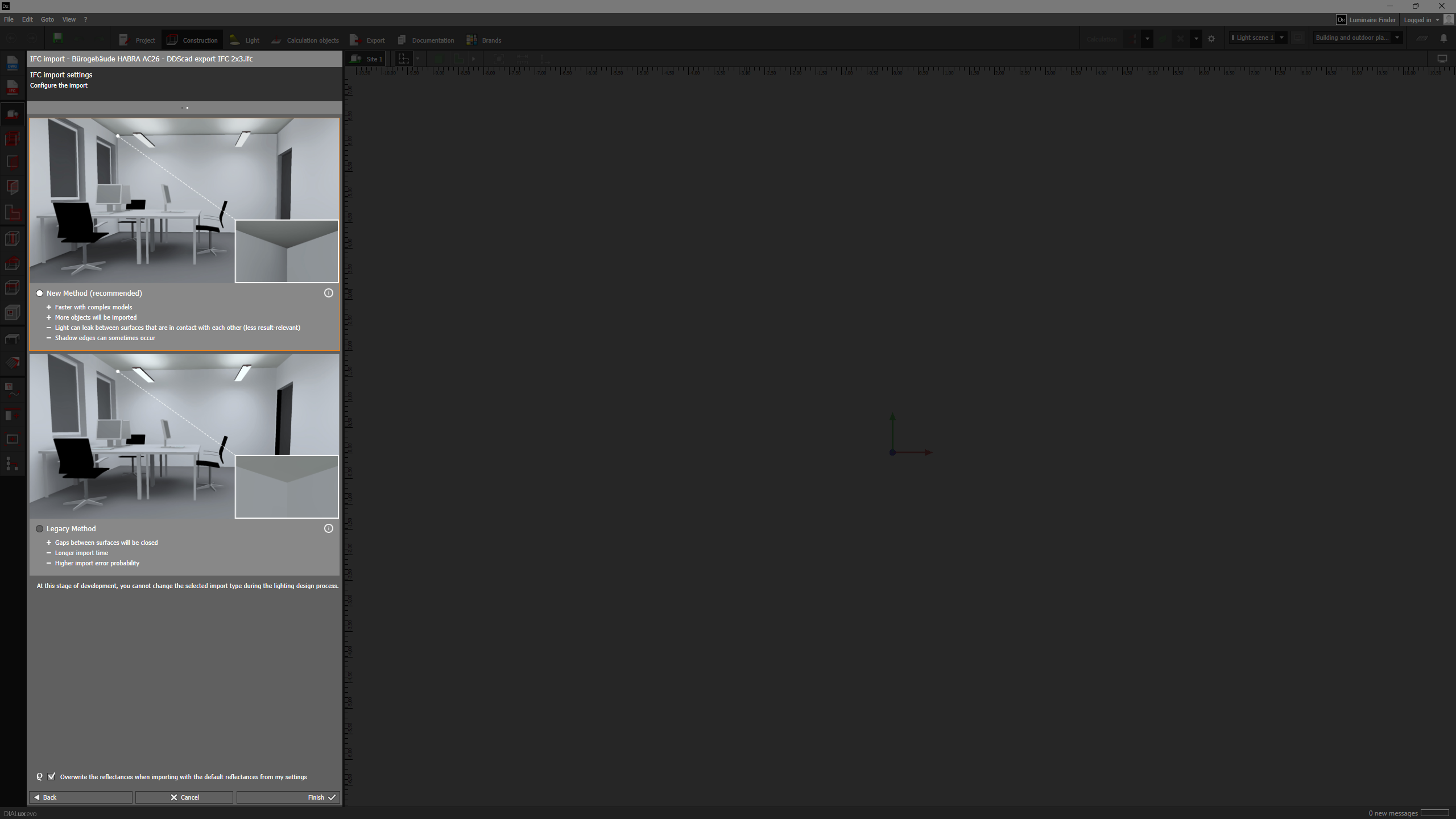DIALux evo 13 has fundamentally improved the import of IFC models (Industry Foundation Classes). A new import method reduces processing time and increases stability when handling complex models, especially for multi-story buildings or detailed projects. As a result, planners can now import IFC data much faster, and the success rate of imports, particularly for complex models, has been significantly increased.