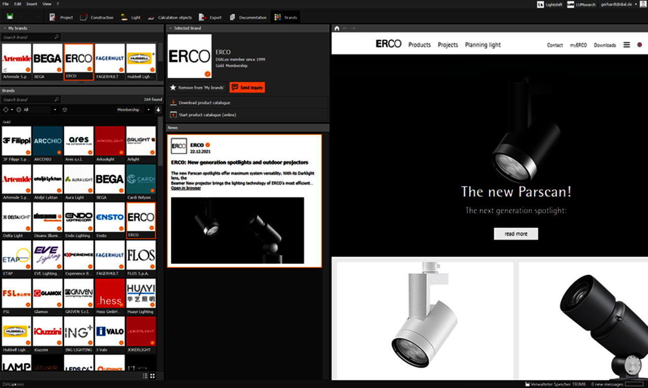 Además, ahora puede enterarse de las novedades directamente en DIALux. Las noticias de sus marcas, como las novedades de los productos o las actualizaciones del catálogo, las recibirá ahora automáticamente en el DIALux Newsfeed.