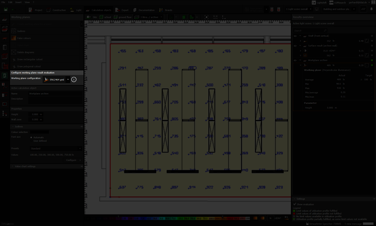 Con DIALux evo 10.1 es posible cambiar entre el resultado adaptativo y un resultado basado en la cuadrícula estándar (según EN 12464-1 y -2) para los planos de trabajo. Muchos de ustedes han solicitado esta función para poder corregir las desviaciones en la determinación de la uniformidad.