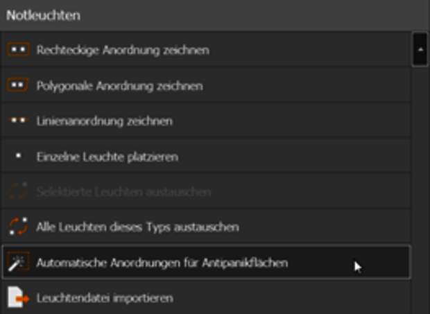 Con esta función, las luminarias pueden colocarse automáticamente para una zona antipánico existente. Se colocan suficientes luminarias para lograr la iluminancia y uniformidad requeridas.