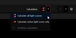 La commande de lancement du calcul a été modifiée : le choix de calculer toutes les scènes de lumière ou seulement la scène de lumière active se trouve maintenant dans une boîte de sélection. La fonction "Poursuivre le calcul" se trouve également ici. Le lancement du calcul d'énergie et les paramètres de calcul sont situés sur des boutons séparés. La suppression des résultats peut être effectuée de manière sélective dans une boîte de sélection.