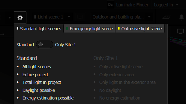 Créez facilement des scènes d’éclairage avec différents niveaux de gradation – pour une ambiance lumineuse adaptée à chaque situation d’utilisation. Comparez les scénarios directement dans le projet et présentez clairement vos idées. DIALux evo documente votre planification de manière optimale. Le logiciel vous montre quelles luminaires appartiennent à une scène d’éclairage et les affiche clairement dans la documentation.