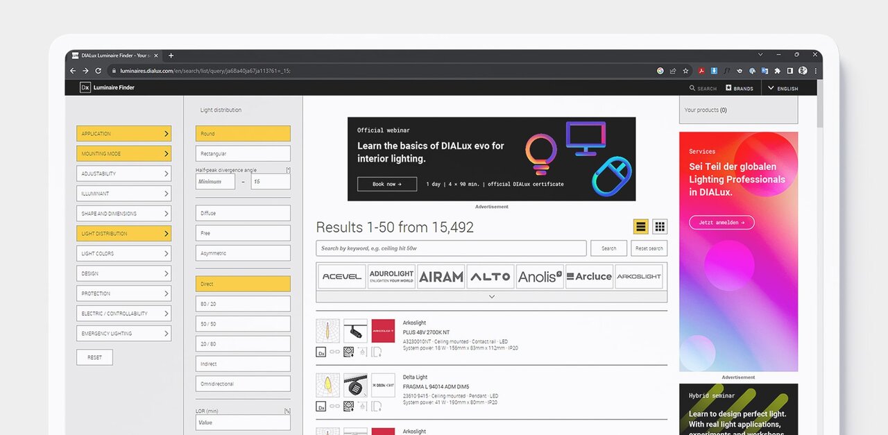 Plus besoin de chercher dans d'innombrables sites web ou catalogues. Le DIALux Luminaire Finder vous offre une large sélection de produits de haute qualité. Les fonctions de filtrage et de recherche permettent de trouver facilement le luminaire adéquat et de l'intégrer dans DIALux evo en un seul clic.