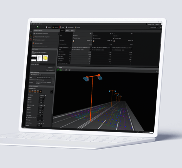 Pianifica percorsi stradali sicuri nel rispetto delle normative. Definisci i profili stradali e scegli la disposizione degli apparecchi. L’ottimizzazione automatica ti aiuta a regolare la distanza tra i pali, le altezze di montaggio e gli angoli di inclinazione per migliorare il controllo dell’abbagliamento e l’uniformità. DIALux evo fornisce un’analisi dettagliata che include classi di illuminazione, curve isolux e indicatori di efficienza energetica (IPEA e IPEI).