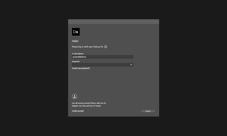 Attualmente il vostro ID DIALux vi serve per avviare DIALux evo 11 e per accedere a my.dialux.com per acquistare o gestire le funzioni di DIALux Pro. Gradualmente, sarà possibile utilizzare il proprio ID DIALux anche per altri nostri servizi. Non appena ciò sarà possibile, vi informeremo in merito.