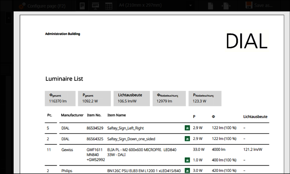 在 文档 模式下,您可以导出标准照明设计和完整的应急照明方案。其中包括所有用于合规性验证的计算结果、应急灯具数据表、灯具清单以及灯具布置图。